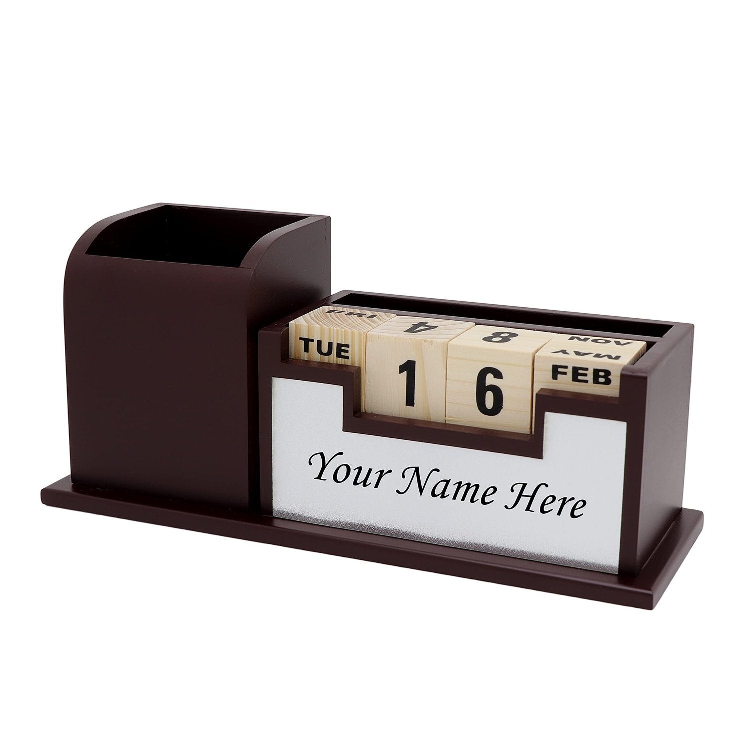 - Material : Wood ; Contains : 1pc of Pen, Calendar and Name on Pen Stand