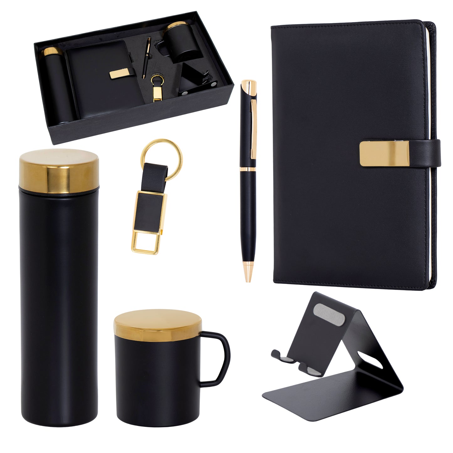 Elevate your workspace with this sleek and sophisticated 6-in-1 gift set. Crafted with premium materials, it includes a soft-covered diary with a magnetic flap closure and pen holder, a 500ml stainless steel bottle with a golden accent for staying hydrated on the go, a stylish golden keychain, a stainless steel coffee mug with a golden accent lid to prevent spills, a metal ball pen with golden accents, and a metal mobile stand. This versatile set combines functionality and style, making it an ideal choice for professionals or as a thoughtful gift. Enjoy the convenience of having all your essentials in one place, while exuding an air of sophistication and organisation.